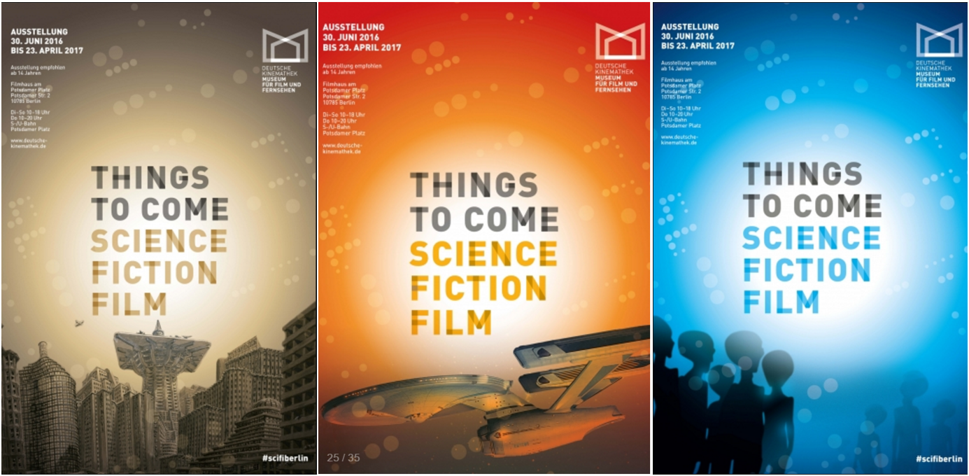 « Things tocome – Science-fiction film » : il reprend la problématique, et dans un second temps il interpelle les amateurs de science-fiction. C’est bien la communication, qui permet de faire connaître l’exposition en dehors des habitués du musée, que ce soit par le bouche-à-oreille, les affiches, les publications dans les journaux ou sur les sites internet. La Kinemathek a réalisé trois affiches différentes, selon les trois principaux sujets abordés : l’espace, la société du futur et l’étranger. L’exposition ayant été inaugurée le 30 juin 2016, il est simple de trouver de nombreux articles critiques. Ce qui a permis à l’exposition d’être remarquée ? La connexion avec les 50 ans de la série Star Trek.