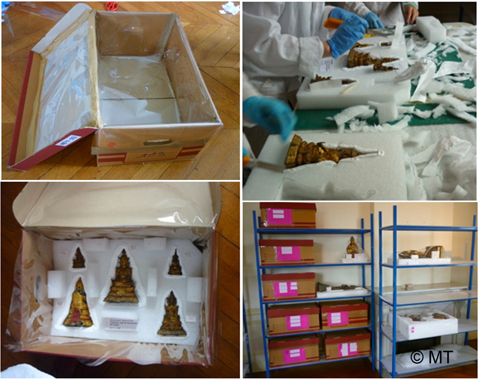 Le cas des bouddhas montre le professionnalisme du conditionnement : les cartons acides ont été protégés par du papier spécial qui est poli d’un côté pour empêcher la réaction électrostatique. Puis les bouddhas sont placés dans des mousses où leur contre-forme est faite sur mesure, puis protégés par du Tyvek©. Le tout est entreposé dans des étagères qui sont venues remplir les anciennes salles d’exposition du musée. Les étages, les salles, les étagères, les rayonnages et les cartons sont numérotés de façon à pouvoir localiser exactement les objets.