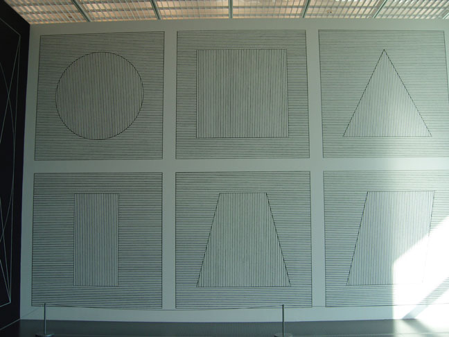 Au moment de ma visite, l'exposition de la deuxième salle portait sur les dessins muraux de Sol LeWitt entre 1968 et 2007, artiste qui porte bien le drapeau de l’art contemporain, et plus précisément de l’art conceptuel. Il a vraiment poussé ce dernier au point de ne valoriser que le concept : il a créé des œuvres (avec un répertoire simple,des lignes et des figures géométriques primaires) qu’il a minutieusement détaillées et réduites à une série d'instructions simples et concrètes, qui pourraient être reproduites par n’importe qui, n’importe où dans le monde. Ce qui m’a paru s’inscrire tout a fait dans l’esprit du Centre Pompidou, qui lassait le visiteur face à l’œuvre tout en restant disponible (via du personnel), si une médiation assistée était nécessaire.