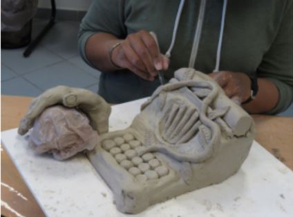 Je travaillais, étant jeune adulte, en tant qu'animatrice de colonie de vacances avec des enfants placés en foyer. Puis, j’ai voulu continuer à me rendre utile une fois devenue sculpteur.J’ai commencé à intervenir au centre social de l’Arbrisseau à Lille. Jeproposais des ateliers communs à des enfants et à des personnes atteintes de la maladie d’Alzheimer qui étaient en hôpital de jour. C’était difficile parce que d’une semaine sur l’autre, les personnes malades ne se souvenaient plus de ce qu’elles avaient fait. Par contre, elles se souvenaient des enfants qui les aidaient à finaliser leurs travaux. Et ça, c’était vraiment magique ! Je veux apporter à ces publics, en leur proposant des ateliers de sculpture, la possibilité de s'exprimer, d’être fiers d’eux, de réaliser quelque chose de leurs mains, et de prendre confiance en eux par ce biais là. Je souhaite aussi leur offrir la possibilité de s’ouvrir à l’art, de s’évader de leur quotidien qui n’est souvent pas facile. Ainsi, ils peuvent trouver un apaisement, sesentir libre mais aussi se confronter à leurs limites et à leurs possibilités. Souvent, les participants aux ateliers me disent « Je ne sais pas le faire » ou « Je n’y arriverai pas » et finalement ils se rendent compte qu’ils y arrivent et qu’ils en sont capables.