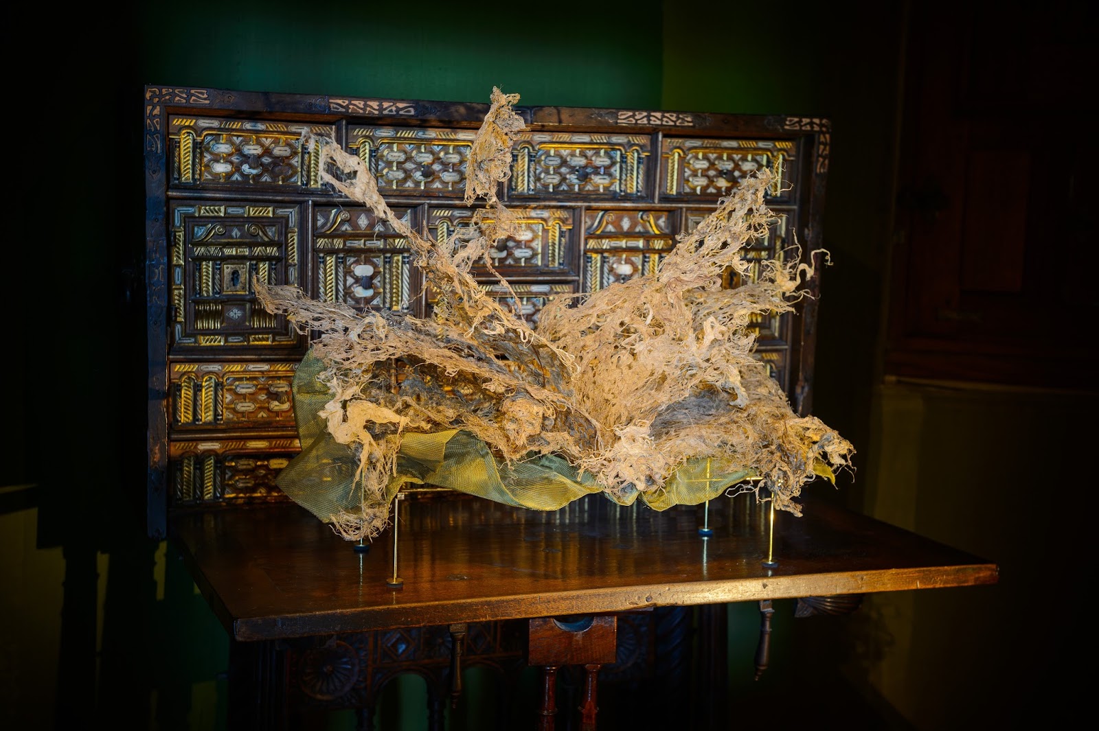 La déambulation se poursuit dans la chambre Renaissance, qui était probablement la chambre de Philippe Lesbahy, l’épouse de Gilles Berthelot. C’est dans le secrétaire, cabinet de retrait de la chambre qu’est exposé un « Livre aux grotesques »,conférant une apparence féerique à la pièce. Réalisé en papier de jonc, il laisse apparaître des ombres de créatures chimériques de par sa forme et les jeux de lumière. Le jonc fait écho aux murs de la chambre de Philippe Lesbahy restaurée en 2013, qui sont recouverts de nattes de jonc. Cette technique de tressage manuel était d’usage au XVIème siècle, car elle permettait d’isoler la pièce par temps froid, et de conserver la fraîcheur en cas de températures élevées.