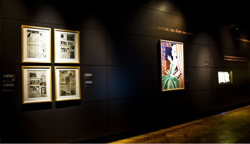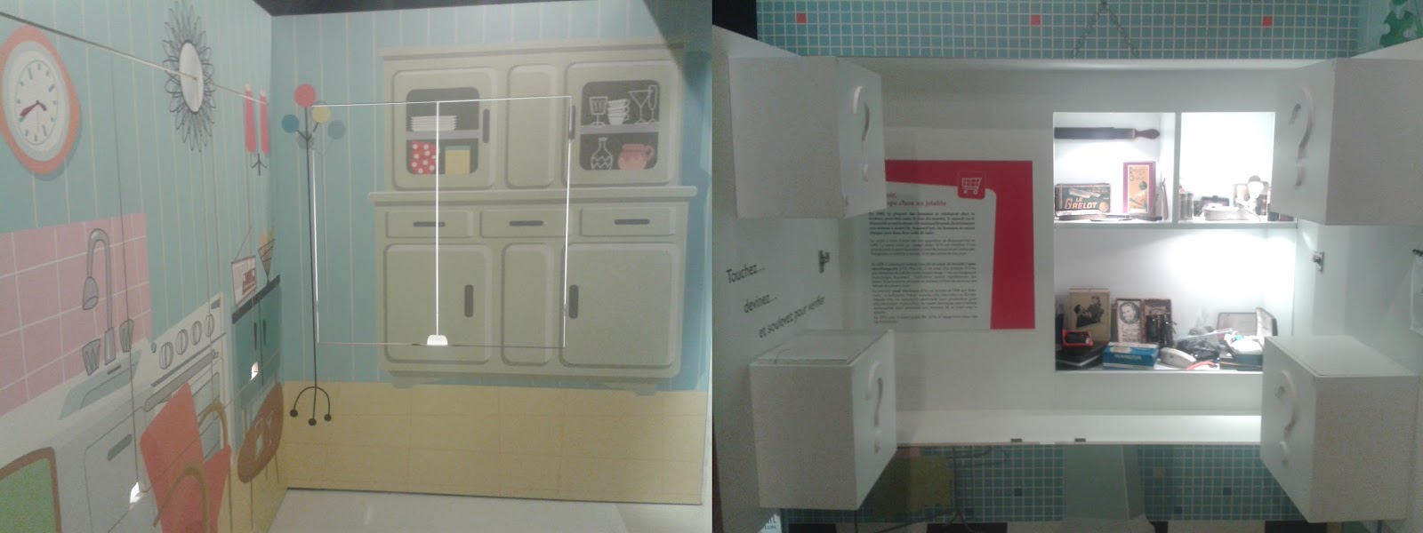 Les parties de l’exposition sont clairement identifiées et identifiables, l’utilisation de couleurs pop sous les vitrines et les panneaux suspendus permet de définir visuellement les univers. Si les formes sont variées, on note une unité graphique ainsi qu’une personnalisation en fonction des thématiques abordées. Les assises qui ponctuent le parcours permettent de visionner les contenus vidéos de l’exposition et d’impliquer le corps. Les éléments visuels affichés sur les murs créent une connexion entre le lieu et l’exposition, de l’inscrire à l’intérieur d’un espace. Ils participent à l’ambiance et indiquent au visiteur sortant de l’exposition précédente que l’univers dans lequel il pénètre n’est pas le même que celui qu’il quitte, et qu’il est libre de s’y laisser absorber.