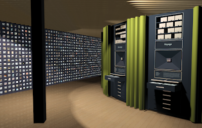 La salle n’est pas une reconstitution mais la suggestion dudit cabinet : le visiteur prend place face à l’écran aux côtés d’un extrait du mobilier original. Un montage sonore accompagne cette rencontre entre deux époques et propose au voyageur de comprendre d’emblée l’esprit documentaire et humaniste de Kahn.