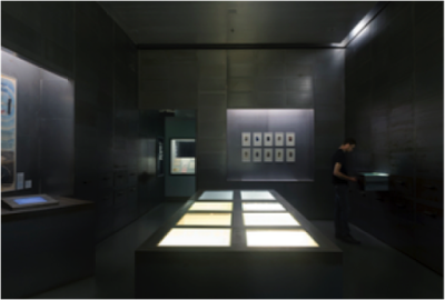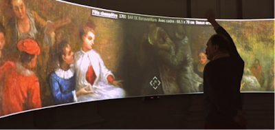 Pour accéder à cette réserve virtuelle il faut prendre la direction de la nef latérale pour y découvrir une salle où se côtoient différentes technologies. Parmi elles, un écran panoramique incurvé qui, grâce au procédé de la Kinect, permet aux visiteurs d’interagir physiquement avec les œuvres. D’un simple mouvement de bras, de main, le visiteur évolue entre les œuvres, en sélectionne certaines et, grâce à la numérisation HD, en découvre les moindres détails. En somme, le visiteur entre dans l’œuvre.