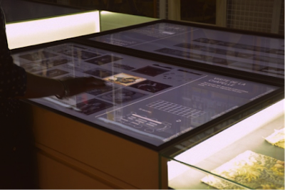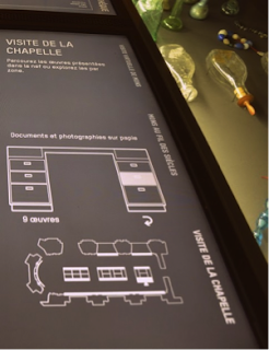 L’expérience ne s’arrête pas là, au centre de la salle sont placés différents mobiliers sur lesquels sont disposées des tables numériques. Trois modes d’exploration sont proposés, de la frise chronologique « Mons au fil des siècles », à la « Visite virtuelle de Mons », en passant par la « Visite de la chapelle », nous sommes amenés à découvrir la diversité des collections montoises. Là aussi le visiteur peut sélectionner une œuvre, puis zoomer pour en découvrir le moindre détail. Pour certaines œuvres l’expérience va plus loin, en les sélectionnant un plan de la salle apparaît, ainsi qu’un schéma du mobilier, des zones précises s’illuminent alors. En effet, certaines œuvres numériques ont leurs pans réels dans la salle, en explorant les différents tiroirs du mobilier les visiteurs découvrent des œuvres de toutes sortes.