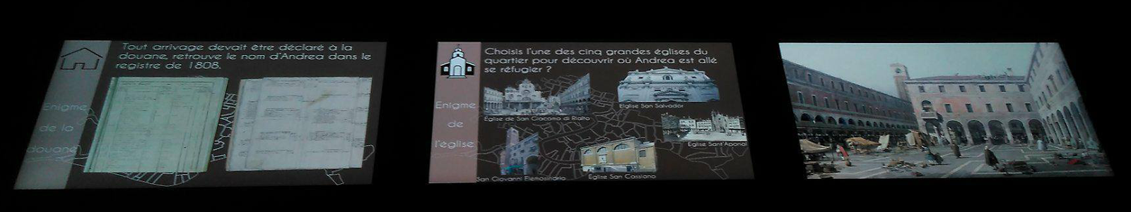Ce dispositif ludique associe un jeu et une maquette interactive de la Sérénissime. Une application sur tablette propose une enquête et une exploration de la Cité des Doges au début du XIXème siècle. Une série de six énigmes successives nous mène sur la trace de l’orfèvre insaisissable qu’est Andrea. Quelques objets connectés et fac-similés ponctuent le parcours, unissant data impalpables et traces concrètes du passé.